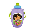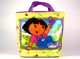 Material (canvas feel) lunchbox with plastic Dora the Explorer design front. Plastic lined and insulated. Zipper closure. Opens from the top. Double material carry handle.