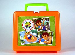 Hard plastic lunchbox. Plastic carry handle on top. Push down latch to open.Approximate dimensions: 8.75" wide x 7.25" high x 3.75" deep.